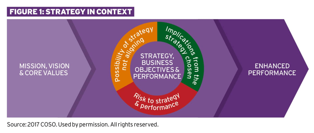 De plus, la gestion des risques favorise une prise de décision plus éclairée. En évaluant les risques associés à différentes options, les décideurs peuvent prendre des décisions plus informées et mieux équilibrées. Cela permet de réduire les décisions basées sur l’intuition ou l’impulsion, et d’adopter une approche plus objective et factuelle. En intégrant la gestion des risques dans le processus de prise de décision, les entreprises peuvent également évaluer les opportunités potentielles et prendre des décisions stratégiques qui favorisent la croissance et le développement. La figure ci-dessous, tirée d’un cadre bien connu en gestion des risques (COSO), nous montre comment la gestion des risques, intégrée à la réflexion stratégique, mène à une performance améliorée2.