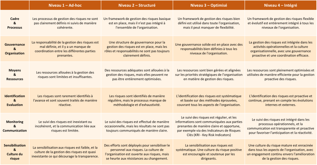 Tips : Si vous pensez que rien ou presque n’est en place, le tableau ci-dessous est un bon début. Si, par contre, vous êtes déjà plus avancé dans le domaine de la gestion des risques, il peut être intéressant d’utiliser l’outil d’évaluation du Risk Maturity Model Org.