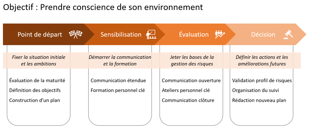 Ci-dessous, un exemple concret de trajet qui peut être suivi lorsque rien n’a encore été mis en place. L’objectif est de se familiariser avec les principes de la gestion des risques et de construire une première image de son profil de risques tout en commençant à impliquer des collaborateurs clés.